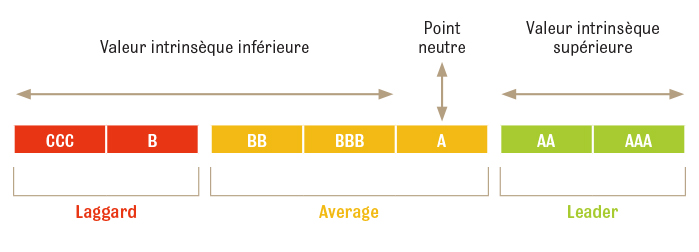 De plus, nos modèles intègrent les risques et opportunités ESG (au niveau du coût du capital) : ainsi, pour une entreprise dont le profil ESG est « Leader » (voir schéma ci-dessous), la valeur intrinsèque de l’entreprise sera supérieure, tandis qu’une entreprise « en retard » (voir schéma ci-dessous) sur le plan ESG aura une valeur intrinsèque plus faible. L’Intégration de données ESG se fait sur la base des notations ESG établies par le fournisseur de données MSCI ESG Research8 (AAA à CCC), la notation A étant considérée comme le point neutre. Les sociétés bénéficiant d’une notation A ne verront donc pas leur modèle de valorisation modifié.