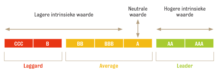In onze modellen zijn bovendien de ESG-risico's en kansen opgenomen (op het niveau van de kapitaalkosten): een bedrijf met het ESG-profiel 'Leider' (zie onderstaand schema) heeft bijvoorbeeld een hogere intrinsieke waarde, terwijl een bedrijf dat op ESG-gebied 'onder het gemiddelde' scoort (zie onderstaand schema) een lagere intrinsieke waarde heeft. De integratie van ESG-gegevens gebeurt op basis van de ESG-ratings die zijn opgesteld door de gegevensaanbieder MSCI ESG Research8 (van AAA tot CCC), waarbij een A-rating als neutraal wordt beschouwd. Voor bedrijven met een A-rating heeft deze integratie dus geen gevolgen voor het waarderingsmodel.